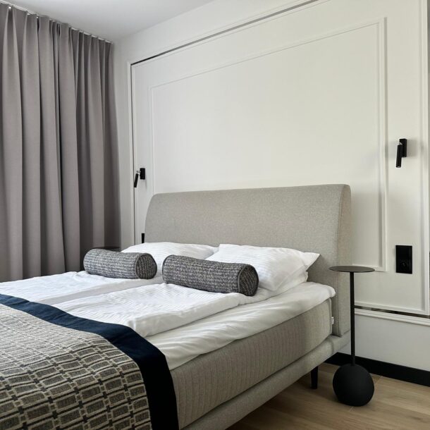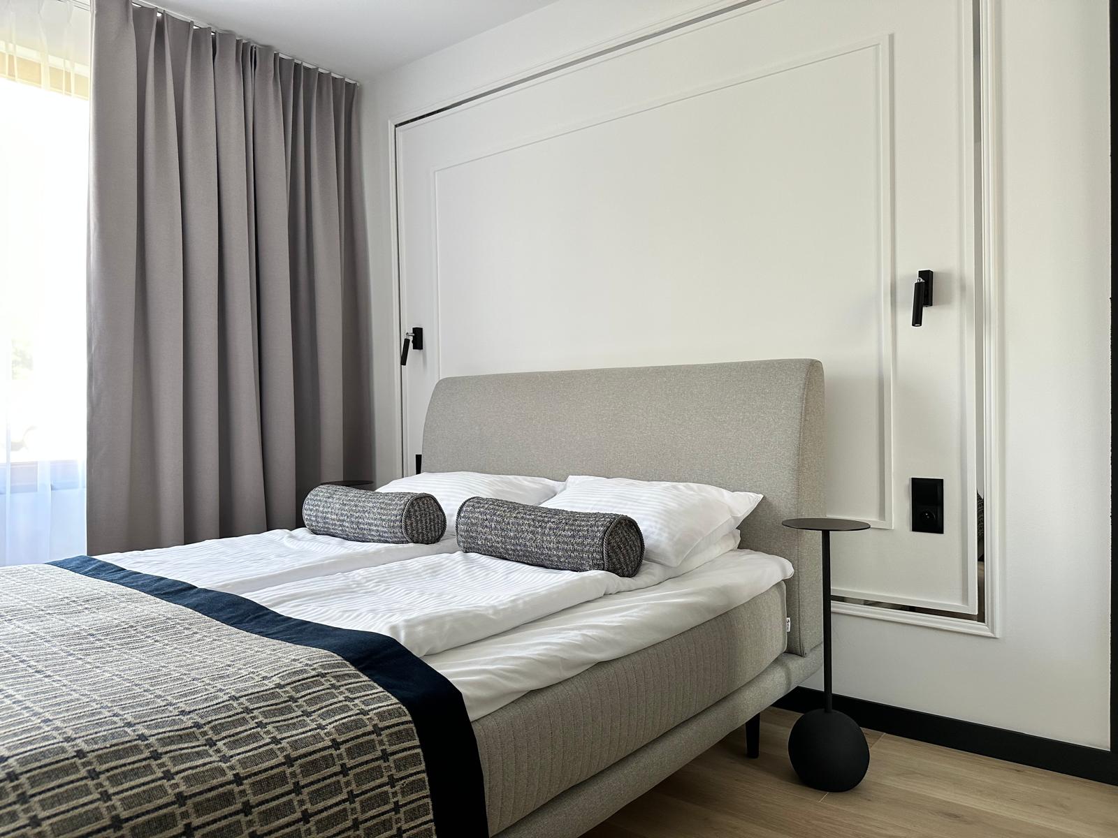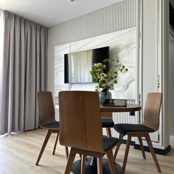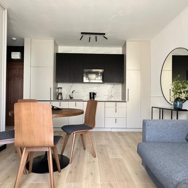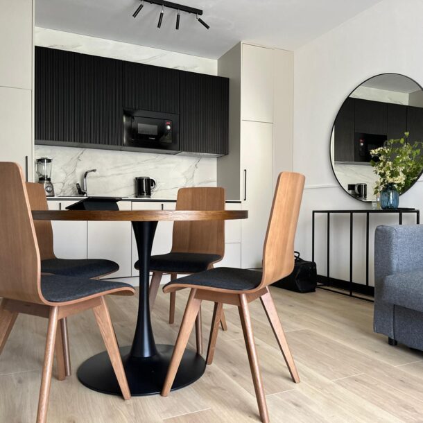 Jasne, przytulne wnętrze apartamentu wyróżnia się nowoczesnym charakterem, co zapewnia komfort wypoczynku. Standard aranżacji z aneksem kuchennym, pojemną lodówką oraz wygodnym stolikiem i krzesłami pozwala cieszyć się przygotowywaniem i serwowaniem dań. Apartament wyposażony jest w dwa wygodne łóżka: jedno dwuosobowe w sypialni oraz sofę dwuosobową w salonie z aneksem kuchennym. Przestronny balkon oferuje piękne widoki na ogród.