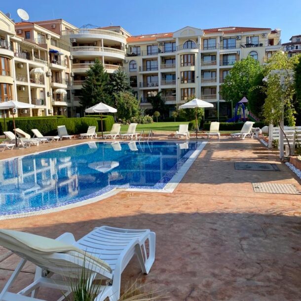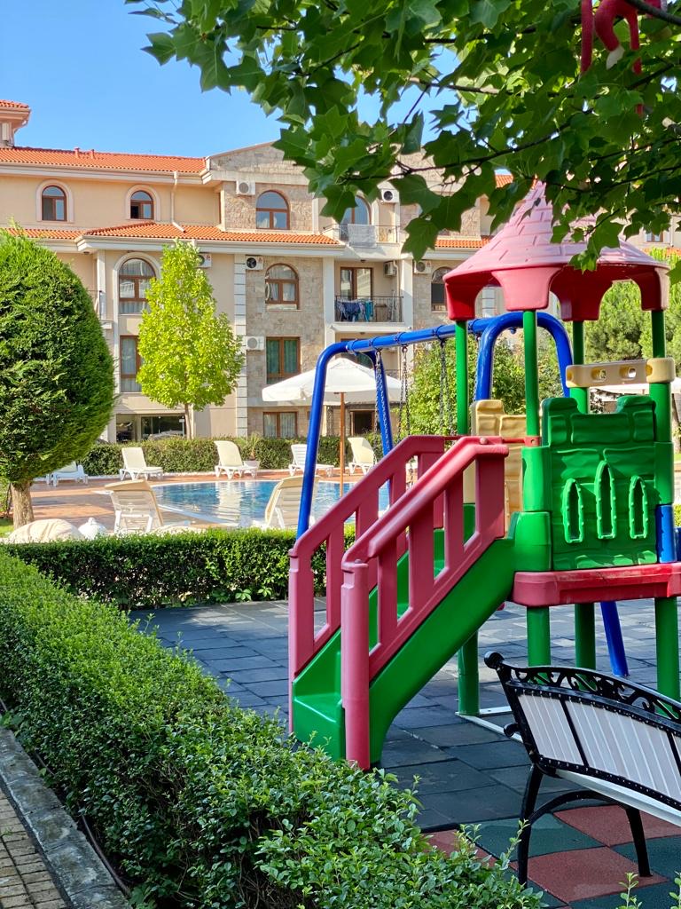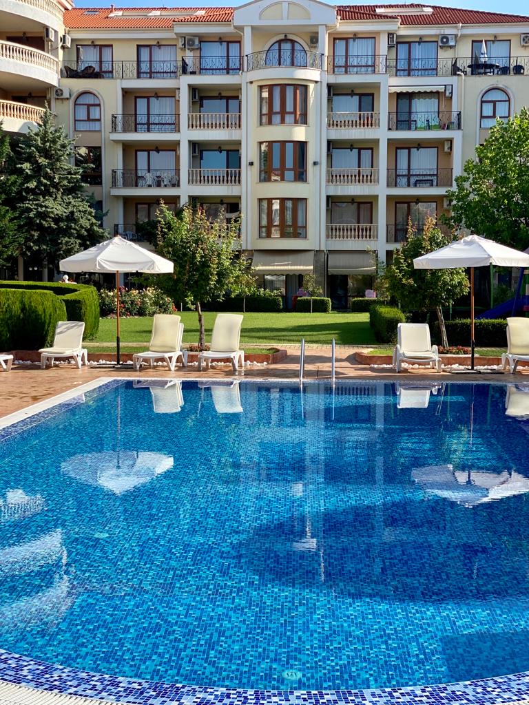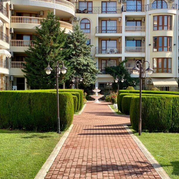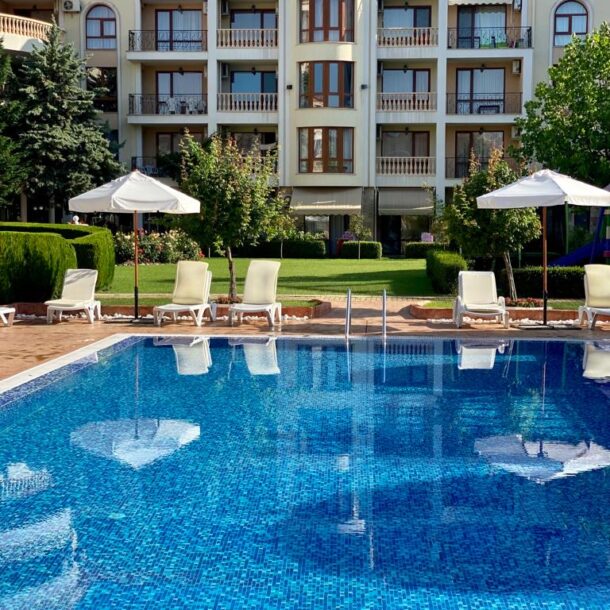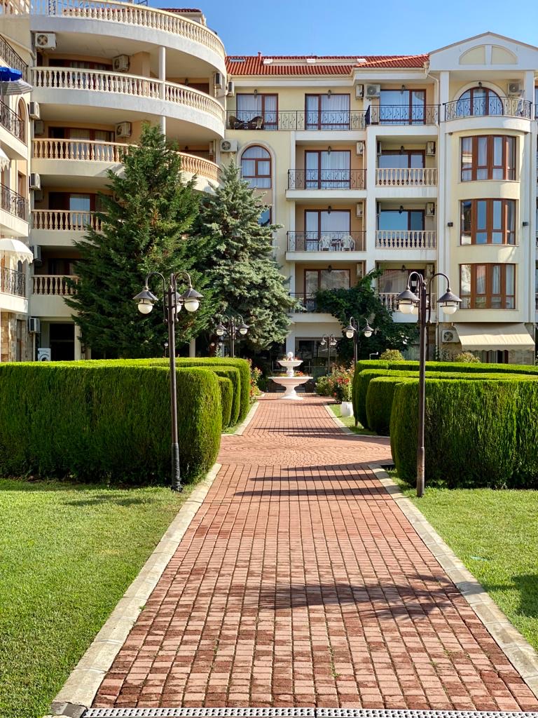 Apartament D14 znajduje się na I piętrze ekskluzywnego kompleksu apartamentów Royal Bay 2 w Sveti Vlas, usytuowany przy samej linii brzegowej Morza Czarnego. Położony w malowniczej dzielnicy Jurta, ten premium kompleks o śródziemnomorskiej architekturze sąsiaduje z uroczą mariną jachtową. Goście mają bezpośredni dostęp do piaszczystej plaży oraz mogą korzystać z basenu, idealnego na orzeźwiające kąpiele w upalne dni. Dla najmłodszych przygotowano nowoczesny plac zabaw. To doskonałe miejsce na udany wypoczynek! Charakter Słonecznego Brzegu dostarcza turystom wielu atrakcji, a Sveti Vlas zapewnia błogi spokój i kontakt z naturą.
