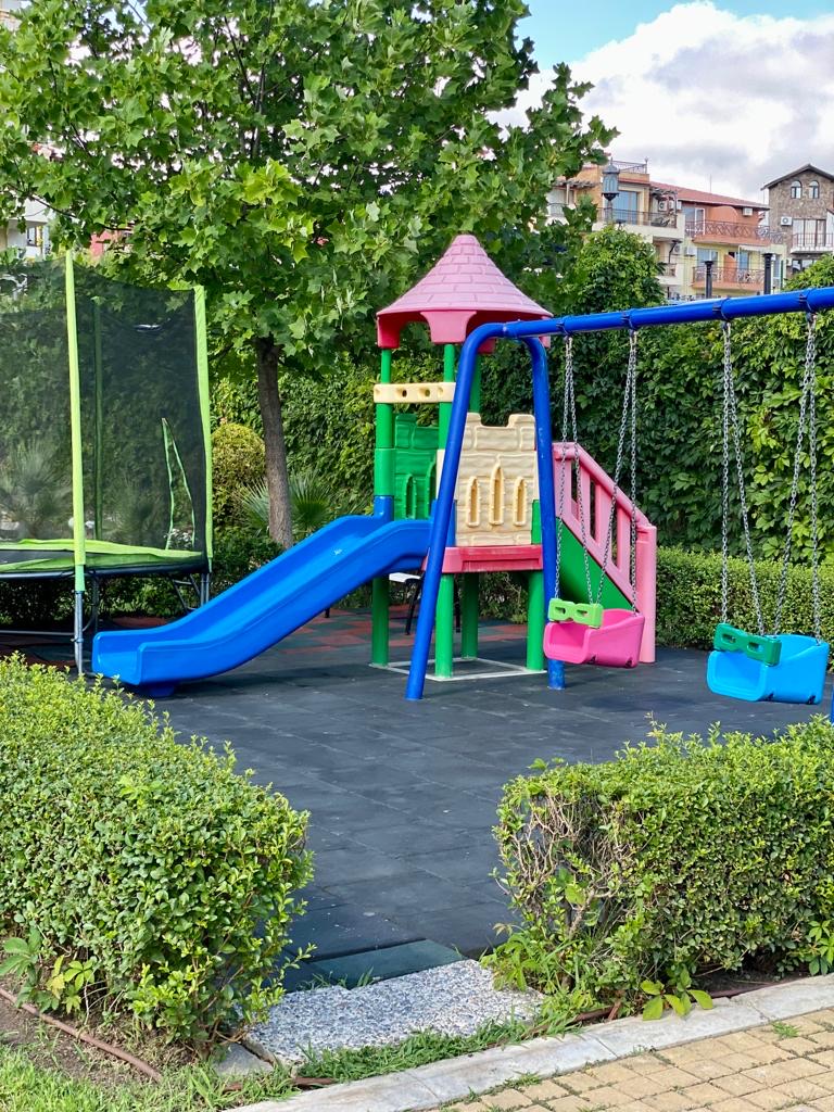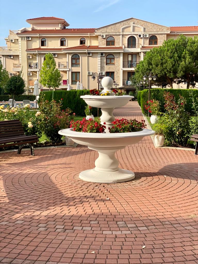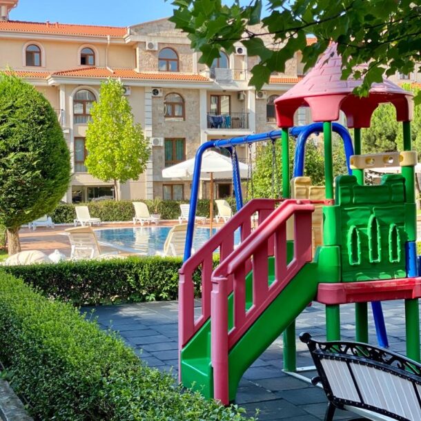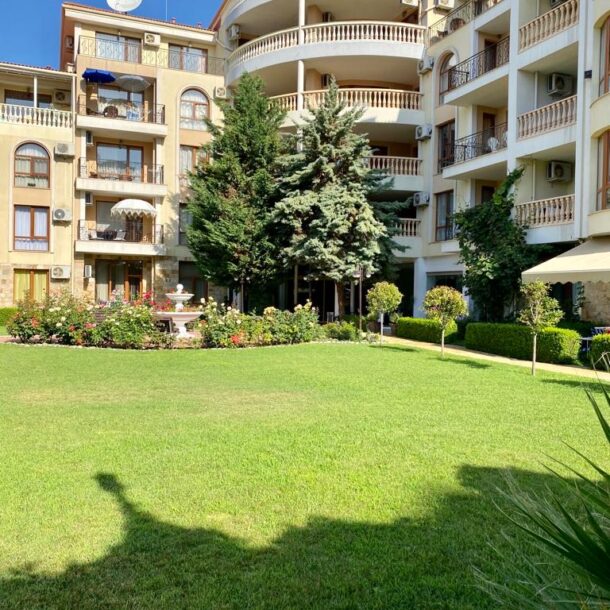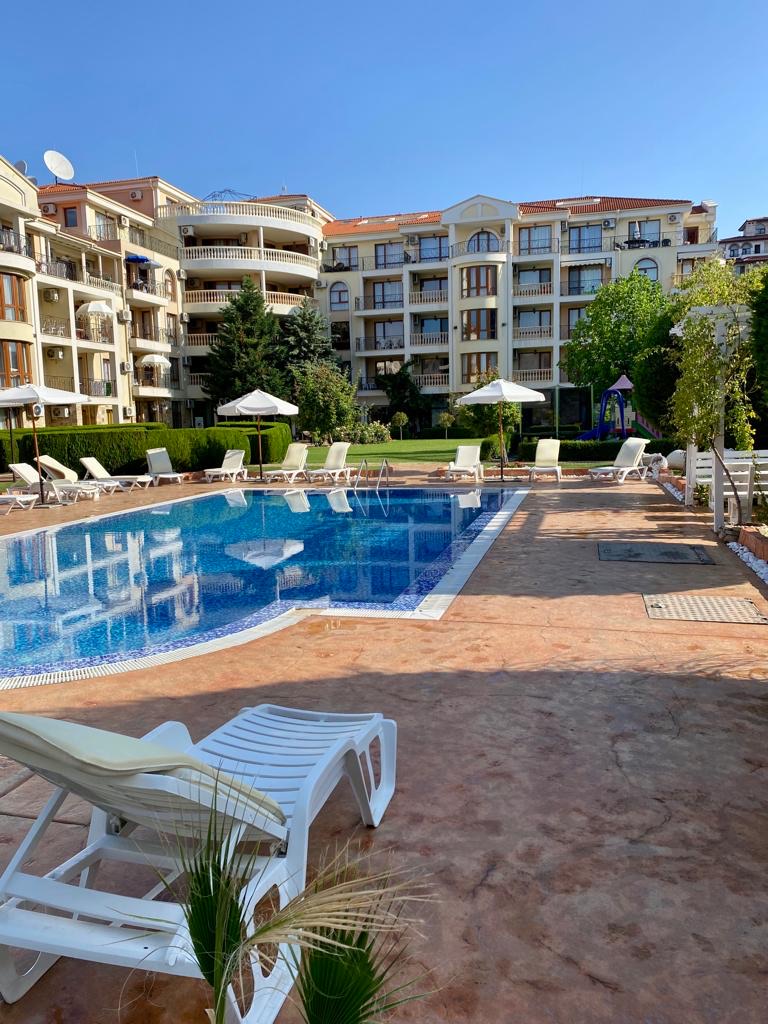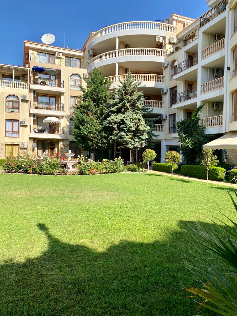 Apartament D14 znajduje się na I piętrze ekskluzywnego kompleksu apartamentów Royal Bay 2 w Sveti Vlas, usytuowany przy samej linii brzegowej Morza Czarnego. Położony w malowniczej dzielnicy Jurta, ten premium kompleks o śródziemnomorskiej architekturze sąsiaduje z uroczą mariną jachtową. Goście mają bezpośredni dostęp do piaszczystej plaży oraz mogą korzystać z basenu, idealnego na orzeźwiające kąpiele w upalne dni. Dla najmłodszych przygotowano nowoczesny plac zabaw. To doskonałe miejsce na udany wypoczynek! Charakter Słonecznego Brzegu dostarcza turystom wielu atrakcji, a Sveti Vlas zapewnia błogi spokój i kontakt z naturą.